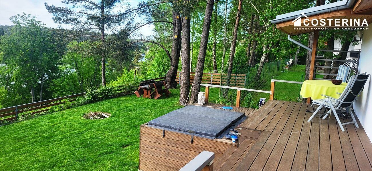 Duży taras z widokiem na jezioro. Na tarasie znajduje się elektryczne jacuzzi. Teren wokół domku jest zadbany i gotowy do użytkowania. Na działce znajduje się dodatkowy domek gospodarczy.